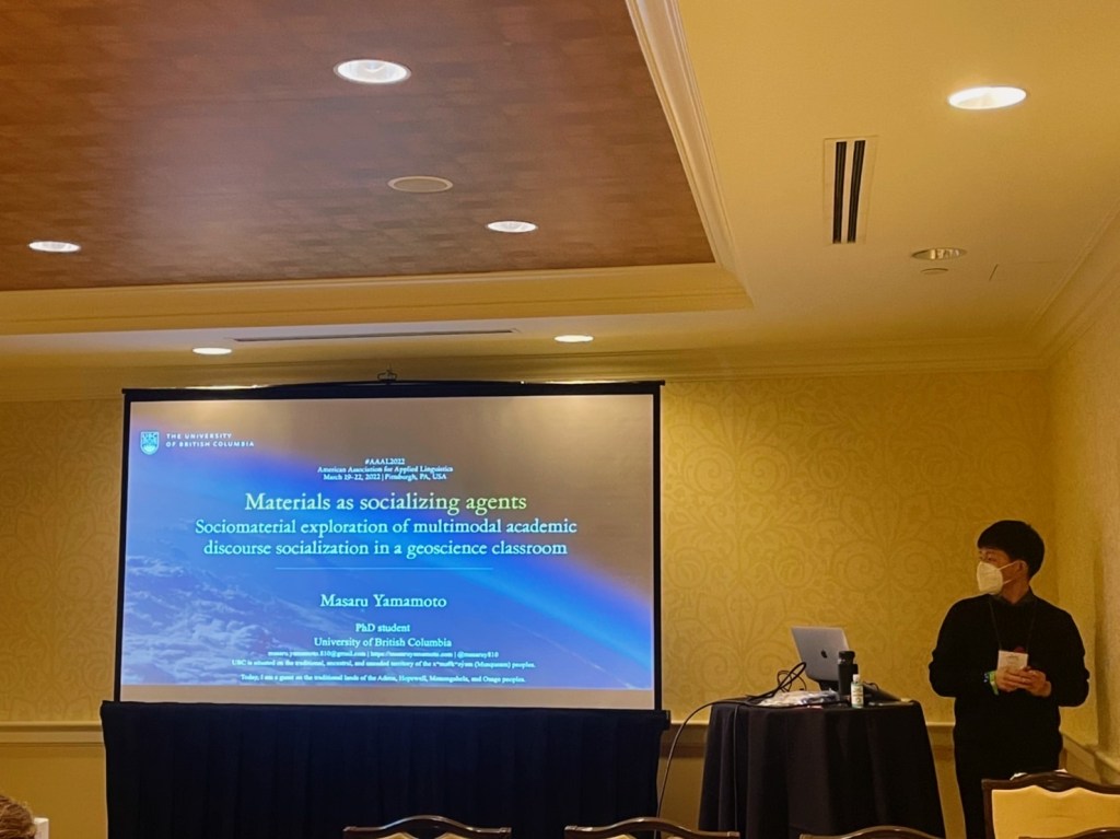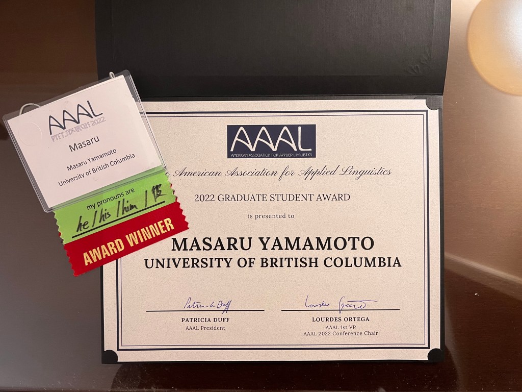 Masaru received the AAAL Graduate Student Award 2022 (with the value of $800 USD) from American Association for Applied Linguistics for his paper entitled “Materials as socializing agents: Sociomaterial exploration of multimodal academic discourse socialization in a geoscience classroom.”